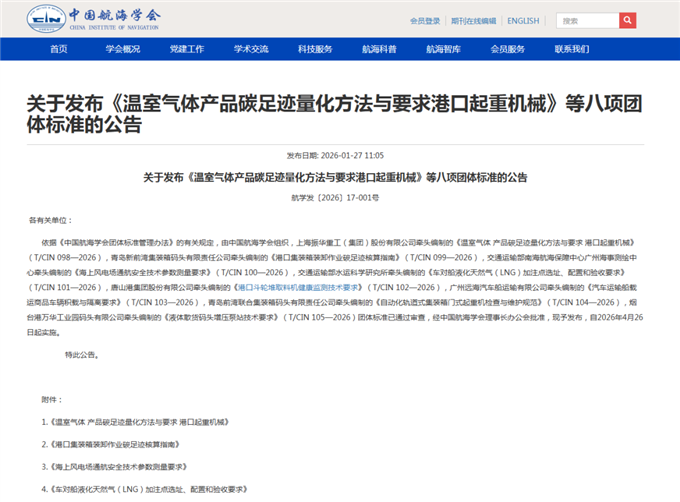 近日,中国航海学会2026年第一号文件正式批准发布团体标准:T/CIN 098-2026《温室气体 产品碳足迹量化方法与要求 港口起重机械》,并将于2026年4月26日起正式实施。公司作为该团体标准的牵头起草编制单位,基于多项港口起重...