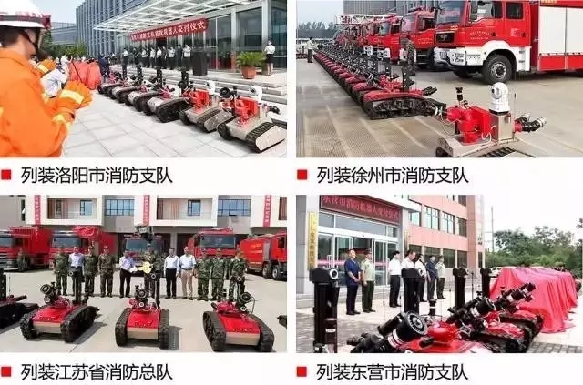 目前为止,江苏省消防总队、徐州市消防支队、洛阳市消防支队、东营市消防支队等一批消防现役部队实现消防机器人列装,并陆续投入应用实战。消防机器人正逐渐列装全国各地公安消防系统,为灭火救援工作保驾护航。