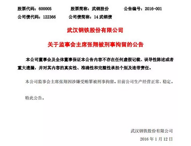 同日,武钢官网刊发消息:武汉钢铁(集团)公司党委常委、工会主席张翔因涉嫌受贿罪被刑事拘留。