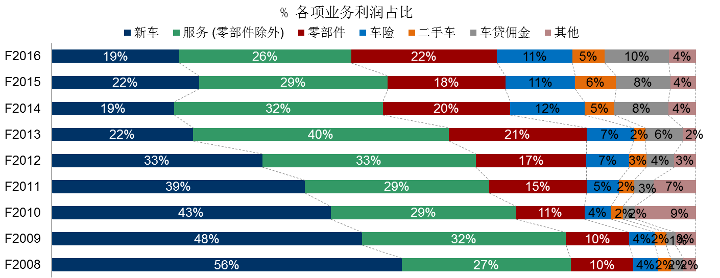 中国经销商的四轮利润推动,分别是新车销售、售后服务和零配件、金融和保险、二手车,数据来源:J.D. Power(君迪)2017中国经销商满意度研究(DAS)