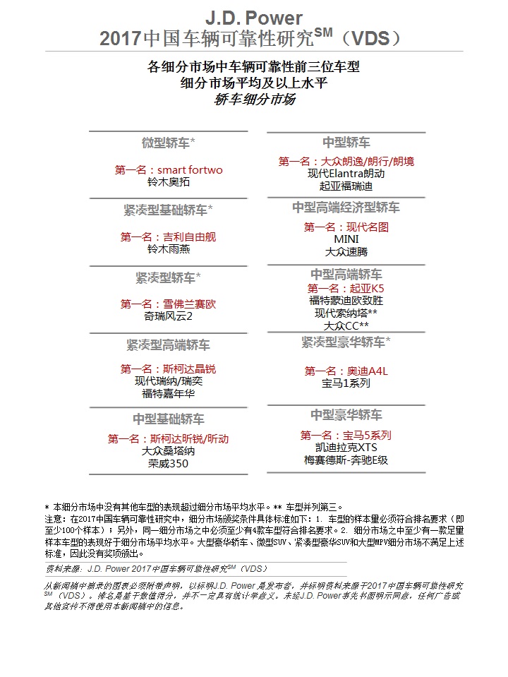 各细分市场中车辆可靠性前三位车型—轿车细分市场