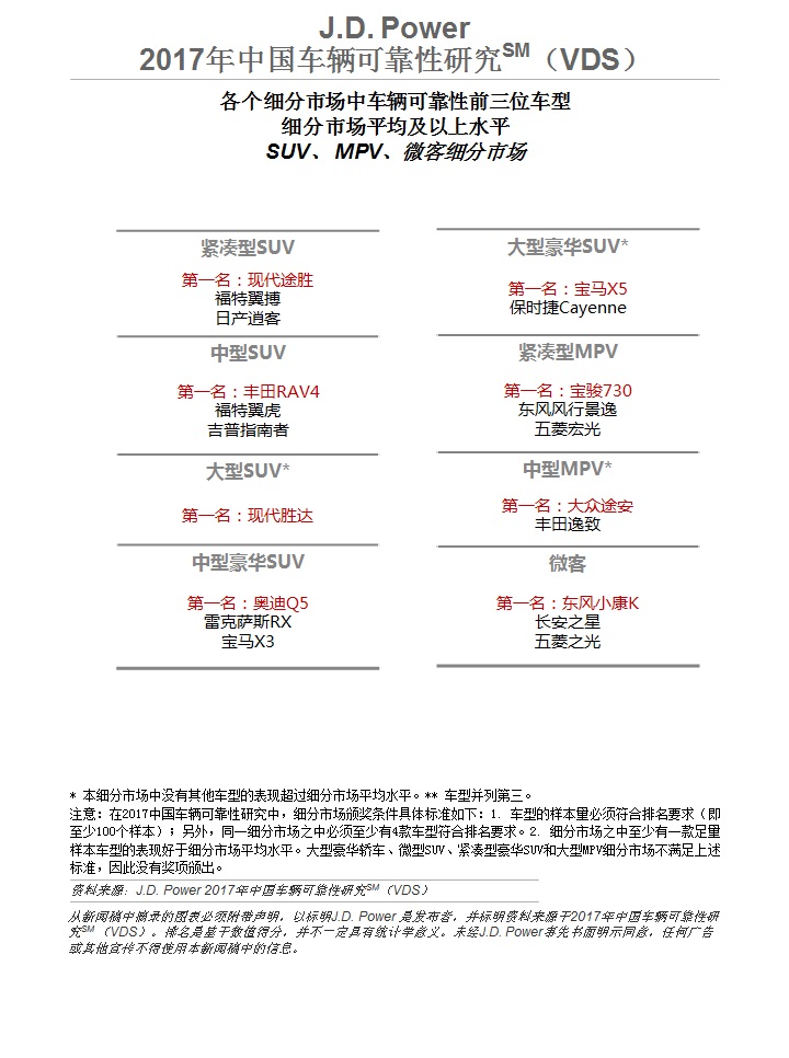 各细分市场中车辆可靠性前三位车型—SUV、 MPV、微客细分市场