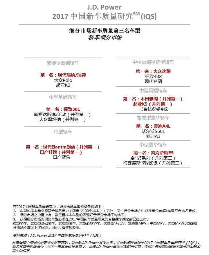 J.D. Power 2017中国新车质量研究细分市场质量前三名-轿车细分市场
