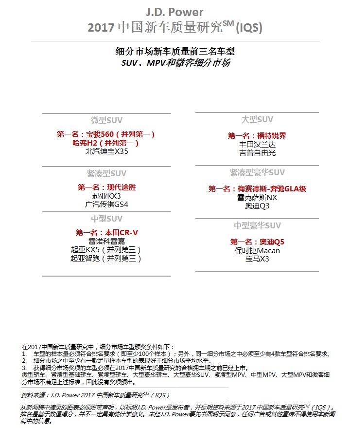 J.D. Power 2017中国新车质量研究细分市场质量前三名-SUV、MPV和微客细分市场
