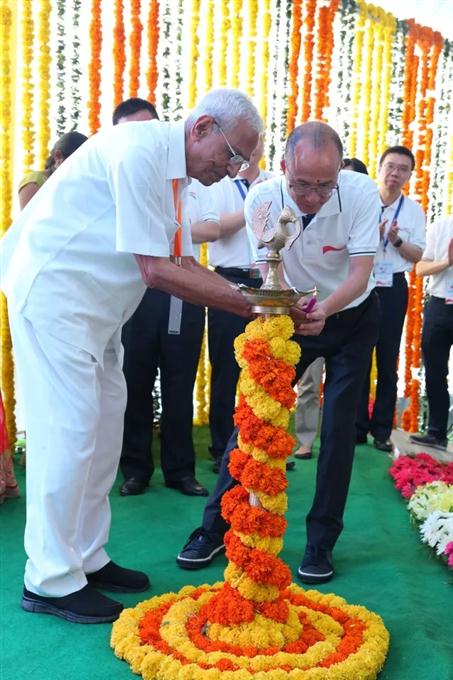 复星集团董事长郭广昌,复星集团联席总裁、复星医药董事长陈启宇,复星医药总裁兼CEO 吴以芳,Gland Pharma 创始人Mr. PVN Raju, CEO Dr. Ravi Penmetsa等一同上台启动印度传统点灯仪式,庆祝Gland Pharma加入复星大家庭,标志双方开启具有里程碑意义的新征程。