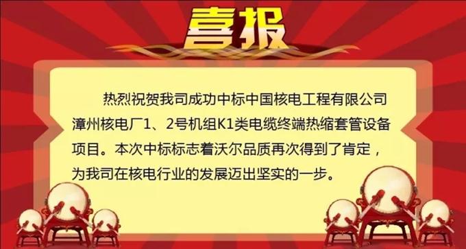 2017年10月16日,深圳市沃尔核材股份有限公司收到中国核电工程有限公司的《中标通知书》,成功中标中国核电工程有限公司漳州核电厂1、2号机组K1类电缆终端热缩套管设备项目。本项目是首次由中国企业为国内核电项目建设提供K1类电缆终端热缩套管设备,为K1类电缆终端热缩套管的国产化、自主化提供了强大助力。