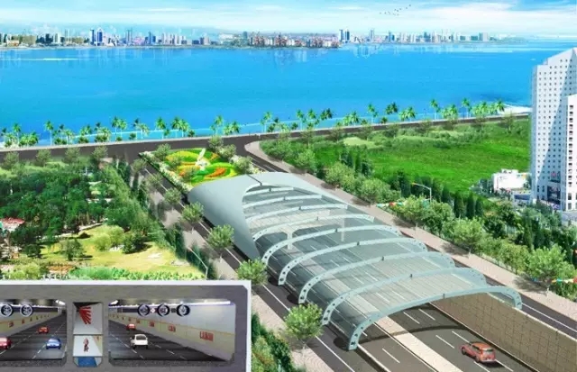 苏埃海底隧道工程由海底隧道、南滨南路立交及北岸接线工程组成,隧道由双孔圆管组成,直径14.5米,每孔分三层,上层是排烟通道,中间是行车通道、下层是人员疏散通道。