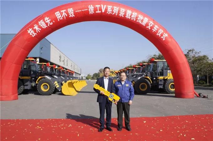 11月9日,在徐工大吨位装载机智能化制造基地,近20台徐工V系列装载机身披红花,整装待发,即将奔赴西北某大型煤矿集团。