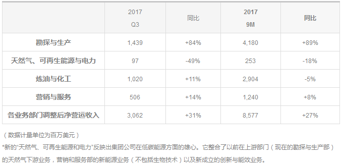 2017年第三季度的非并购投资为31亿美元,前9个月为100亿美元,符合集团本年度140亿美元的投资目标;成本下降将超过36亿美元,超出本年度目标;2017年前9个月,运营资本变动前的营业现金流为150亿美元,同比增长30亿美元,而且凭借低于20%的净权益负债率,集团的资产负债表持续加强。这使得集团能够充分利用低成本环境,实施赢利性增长的战略,启动高回报的项目。