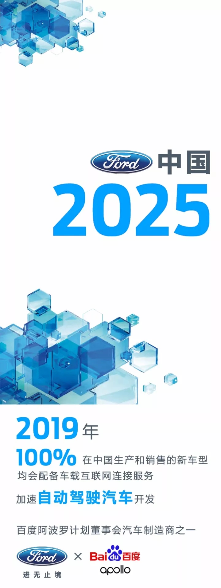 根据今年初所签署的协议,福特汽车将会成为百度阿波罗计划董事会中仅有的三家汽车制造商之一。百度阿波罗开放平台将加速自动驾驶汽车的开发,测试及商业化推广。加入阿波罗计划将有助于福特汽车在机器人及人工智能研发方面的发展,能让福特汽车深入了解中国自动驾驶汽车开发的主要平台,并在其进一步发展过程中发挥重要作用。