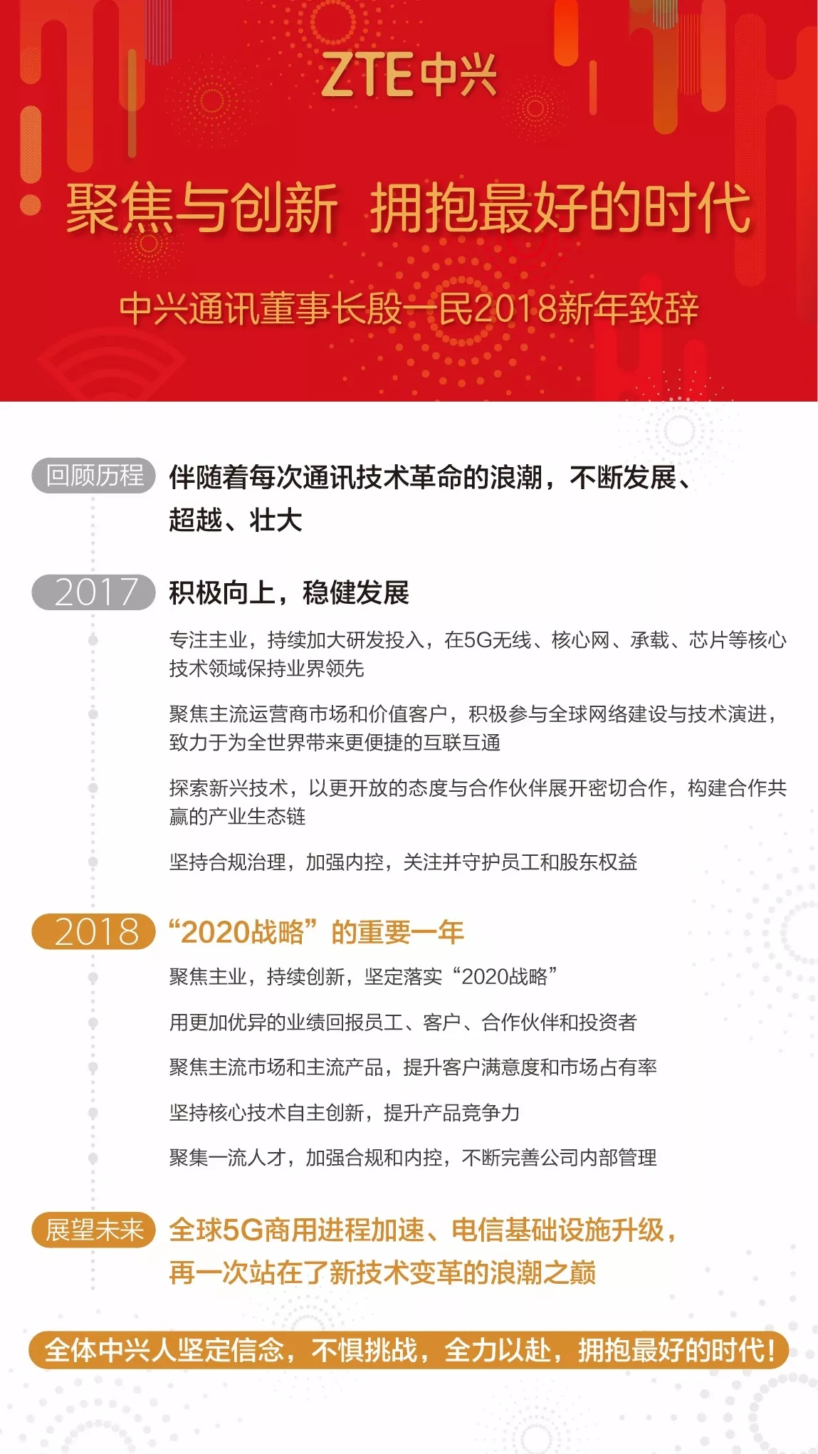 日前,中兴通讯董事长殷一民发表题为“聚焦与创新,拥抱最好的时代”2018新年致辞。