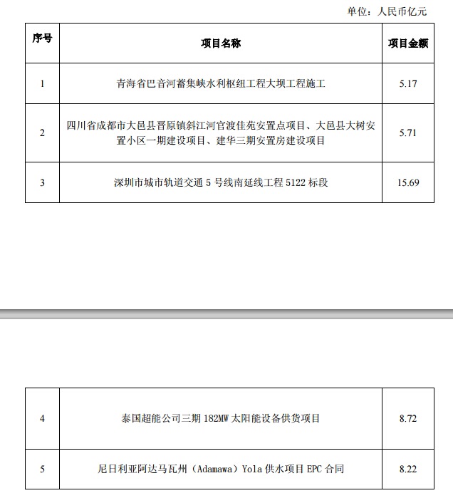 除已公告的深圳市茅洲河(宝安片区)水环境综合整治项目(中标金额约为人民币123.07亿元)外,1月公司中标金额或合同金额在人民币5亿元以上的单个项目还有: