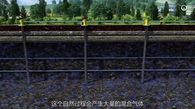 在密封的填埋区内,因为缺氧有机废弃物开始发酵,产生大量混合气体(甲烷、二氧化碳、氮气等)。这些气体通过纵横交错在垃圾层中的垂直气井和水平气井传输到发电厂。