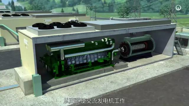气体提纯后,通过燃烧供给内燃机。内燃机发电后一部分用来厂区区自用,另一部分被输送至全国电网。燃烧产生的余热也可以被热交换器传输至附近区域供暖网络或者工农业设备。