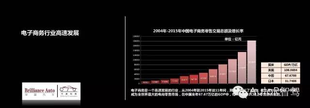 我们先跟大家分享一下电子商务行业的发展趋势。这是从2004年到2015年11年期间中国电子商务发展情况,它的规模在短短11年期间成长了20倍,从2004年的9293亿到2015年的近18万亿,实际上在这个过程中,中国的电子商务,包括它的零售额,在我们GDP中已经占据越来越多的比重。
