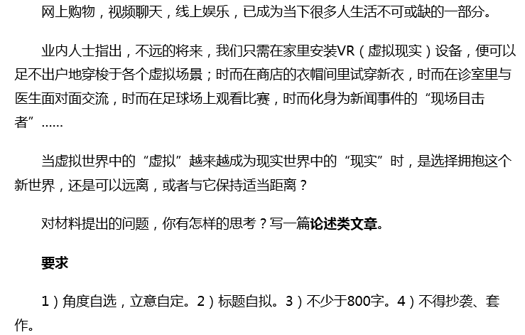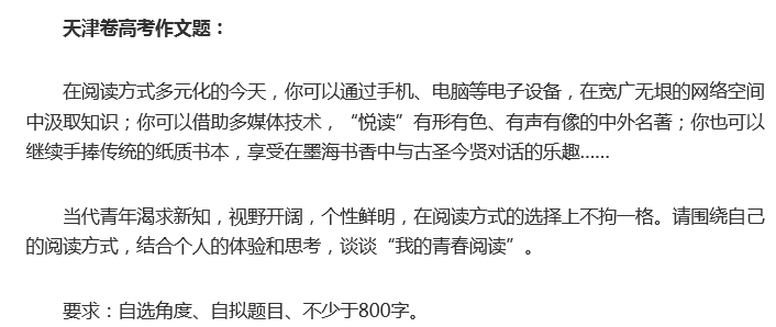 除了虚拟现实,今年在各省市的高考语文作文题中很多都是和互联网科技相关的话题,再比如天津考题: