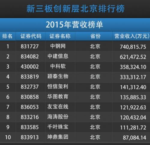 在北京创新层2015年营业收入排行榜中,中钢网(831727)2015年营业收入74亿元,居北京创新层2015年营业收入榜榜首。中建信息(834082)2015年营业收入62亿元排名第二;中科软(430002)2015年营业收入35.8亿排名第三。