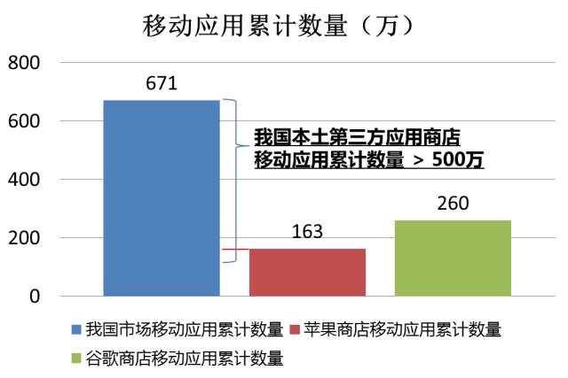 2016年4月,我国市场[1]中的移动应用[2]累计数量达到671万款,我国本土第三方应用商店移动应用累计数量超过500万款,苹果商店移动应用累计数量超过163万款,而尚未官方进入我国市场的谷歌商店移动应用累计数量约260万款。我国本土的第三方应用商店累计聚合的应用数量,已超越苹果、谷歌两大全球领军商店。
