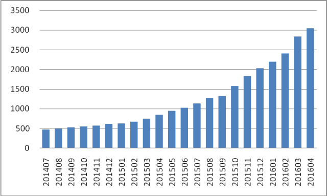 在线约车类应用市场快速增长,截至2016年4月,该领域已成功吸引开发团队1500余个,发展应用数量接近4400个,分发规模达105亿次,约合每国内移动互联网用户下载/更新近10次;