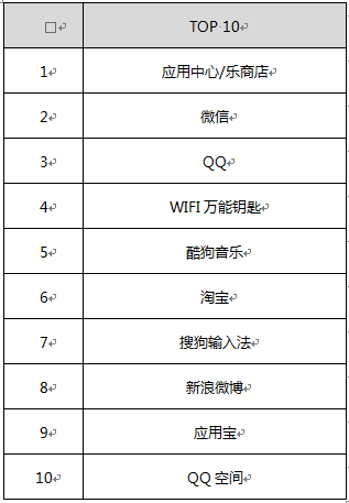 表1:面向Android热门应用排名TOP10