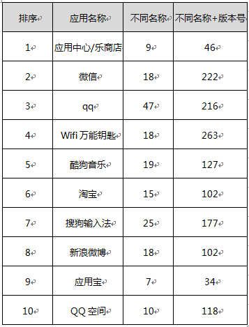 表2:面向Android热门应用排名TOP10的版本变种