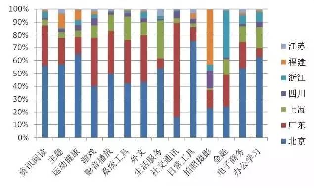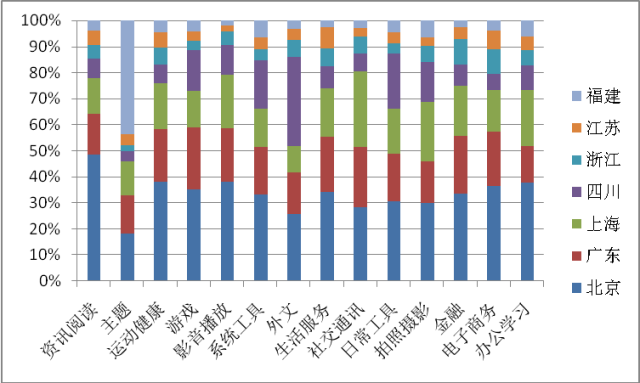 从国内不同区域在移动应用各业务领域中的发展比较布局上看,从应用开发数量角度,诸省份在各业务领域布局侧重各异,北京在阅读领域占比最高,福建则占据主题壁纸类应用开发的40%份额,其中开发者“魔秀主题”围绕主题壁纸共开发了超过14000款应用。