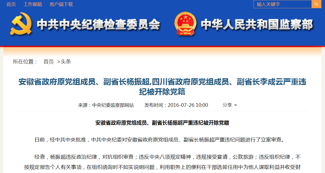 工业头条获悉,中央纪委监察部7月26日消息,安徽省政府原党组成员、副省长杨振超,四川省政府原党组成员、副省长李成云严重违纪被开除党籍。
