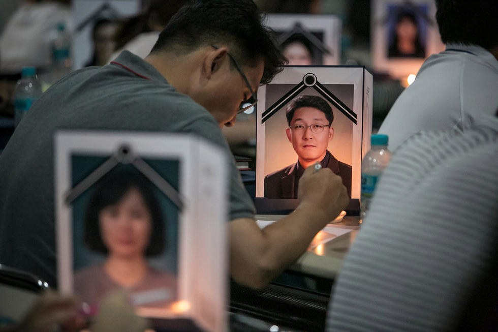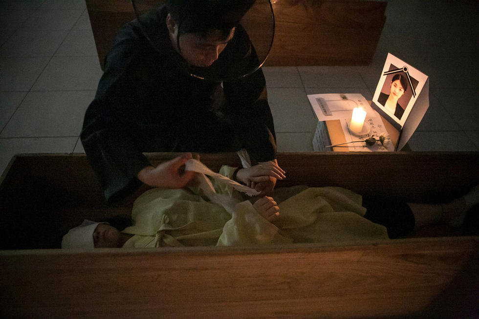 按照韩国传统,穿着黑衣的仵作要用白麻布绑住死者的手脚,并盖在他们的眼睛上。