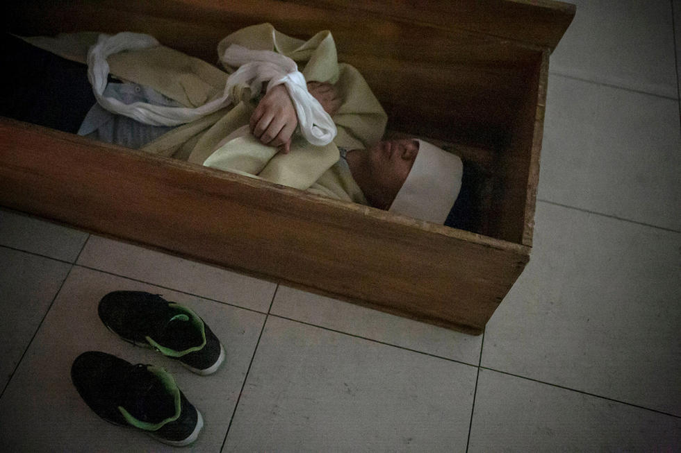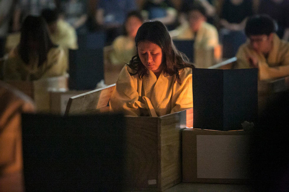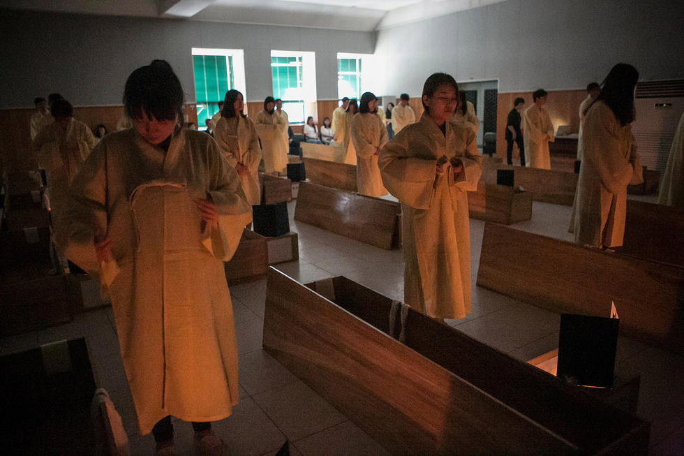 然后大家穿上传统的粗麻寿衣,坐在棺材中冥想。