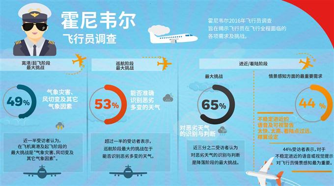 众所周知,天气状况会对飞机飞行产生巨大影响。恶劣的天气不仅会导致航班延误,甚至会提升空难事故的发生率。霍尼韦尔此前所进行的一项调查显示,在受访的3019名中国飞行员中,有接近一半人认为,天气因素是飞行各个阶段影响安全及效率的最大挑战。这其中,49%的受访者认为,在飞机起飞及离港阶段,气象灾害和风切变等其它天气因素是飞行安全的最大挑战;53%的受访者表示,他们在巡航过程中最大的挑战在于能否准确识别恶劣多变的天气;65%的受访者认为对恶劣天气的识别与判断是他们在降落阶段的最大挑战。研究结果表明,飞行员渴望获取及时、必要的气象信息,以便准确且迅速地做出最佳决策。