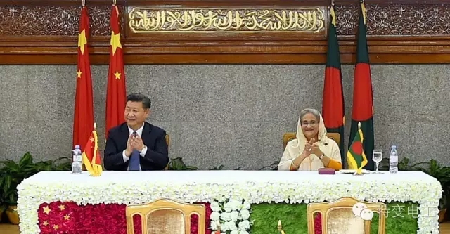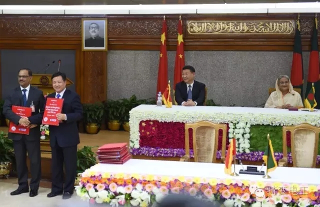 10月14日下午,在孟加拉国首都达卡总理府,国家主席习近平、孟加拉国总理谢赫•哈西娜共同见证了新疆特变电工与孟加拉国达卡配电公司超111亿元人民币的首都达卡地区智能电网和升级项目。王沪宁、栗战书、杨洁篪,商务部、外交部、发改委等领导和部门出席了签约仪式,进出口银行、中石油、特变电工等6家企业现场签约。