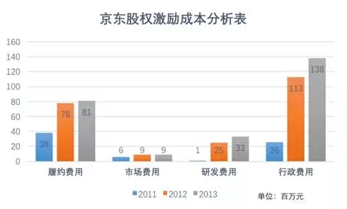 从上图可以看出,京东的股权激励最大收益者是中高管人员(行政费用),其次就是物流配送体系的人员(履约费用),而同样作为职能板块的市场和研发相对于物流配送体系则差距非常大。这也验证了京东在这个阶段,通过对关键物流人才实施股权激励,支持京东打造快速配送这个核心竞争力的大战略。