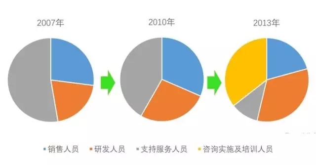 用友网络在2007年和2010年推出的股权激励计划中,其激励对象主要针对的骨干人员是开发、销售和支持服务人员。为了配合此业务模式升级的战略,用友在2013年大幅增加了咨询实施和培训人员,其中有一部分是从原支持服务人员转化而来,这个与战略匹配的人才结构与之前发生了显著变化。如下图所示: