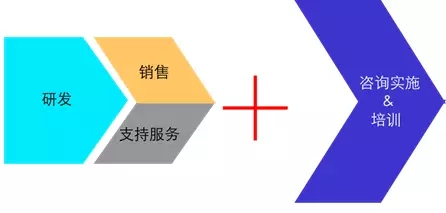 用友网络在2013年年报“董事会报告”中提出业务模式为“面向大型企业的产品与解决方案业务,采取解决方案、咨询实施服务以及标准产品支持服务相结合的业务模式,依托深化客户经营的策略,持续增强产品优势,强化项目全生命周期管理,提升项目收入和利润。”其业务模式与之前相比,着力于先通过咨询为客户提供解决方案,再整合标准化产品进行落地,业务模式升级如下图所示: