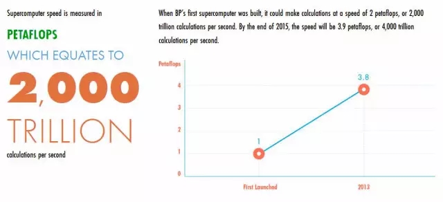 超级计算机的运行速度有多快?它每一秒钟都能完成近4个“千万亿次” (petaflop)的计算,相当于3.8千兆次的运算速度。而BP的第一台计算机只有1个petaflop,如今几乎是指数级的增长!
