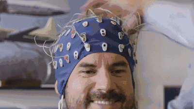 Santosh将一个外形酷似游泳帽的东西戴在了我的头上。这个帽子内部有许多孔,Santosh将一些凝胶挤入这些孔中,然后将32个电极拧入帽中并贴合我的头皮。我拖着一条老式的带状电缆,就像是扎了一根马尾辫,电缆的另一端连接着电脑和点阵打印机,真是酷极了。