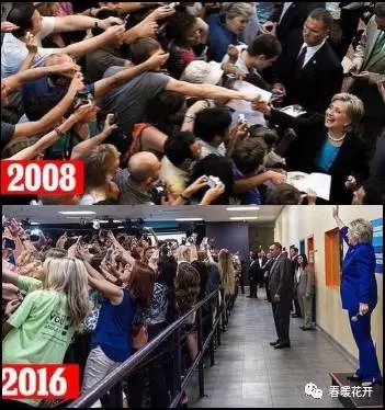 我们都说今天的黑天鹅事件很多,但是相信这两张图能表达我要说的问题,希拉里两次竞选总统,你会发现2008年时人们的表现和2016年的表现是完全不同的,2016年会发现所有人把她当背景,但是2008年时人们都当她是中心。所以各位认为是黑天鹅事件,我认为不是,最大的问题是人变了,然而我们没有跟得上。我们大部分人还是用自己的角度去看这个世界,但这个世界确实已经变了。