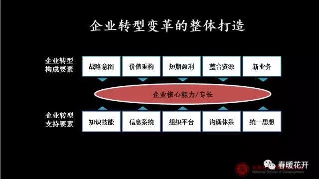 那么我们一定调整整个资源的理解,如何开放和组合,更重要的是在原有的体系里长出新业务,我们很多时候不能转型的原因就是:任何新的东西在体系内都会死掉。这个是你不能够去做转变的原因。在这样大的调整中,什么可以支持这个转型,我认为是五个体系的改变来支撑的,包括公司知识技能、信息系统、组织平台、彼此沟通的系统、对公司整体发展思想上的认识。能做到这样,就是你自己的核心能力和专长的调整,甚至对你所有的经验都要放掉,因为这是一个整体的改变,而且是一个彻底的调整,如果我们不能从这个方向去做,实际上是不可能调整过来的,因此就有一个我称之为能力的打造过程。