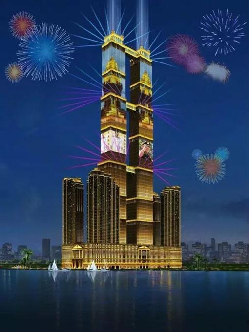 该项目由柬埔寨泰文隆集团和澳门新建业集团共同投资,总投资27亿美元,建筑面积152万平方米。其中两幢133层双子塔楼,高约560米,将超过高452米的吉隆坡双子塔,成为东南亚第一双子高楼。