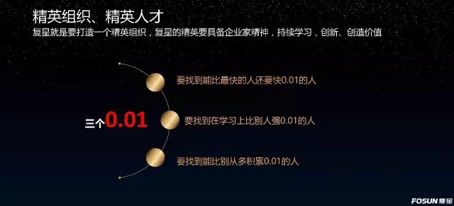 因为复星和大家的存在而让世界不同,我们应该是精英组织,一个由精英们组成的组织。所以,在座的各位跟别人不一样的,怎么不一样法?我们要代表中国到全球去踢世界杯,我们要做冠军。那复星对精英的标准是什么呢?用汪同学和康同学的说法,可以把复星精英的标准总结为三个“0.01”: