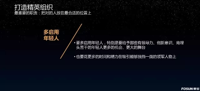 1、年轻人是复星的未来,是我们组织的新鲜血液。我们要多启用年轻人,特别是要给予那些有领导力、有创新意识、肯埋头苦干的年轻人更多的机会、更大的舞台。但同时,我们也要花更多的时间和精力在吸引能够独挡一面的领军人物上。