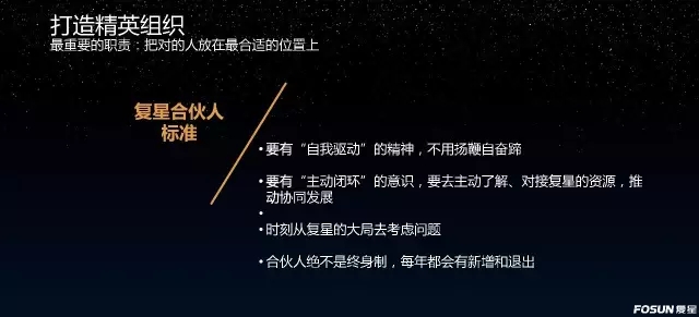 1、复星的合伙人一定要有“自我驱动”的精神,不用扬鞭自奋蹄;要有“主动闭环”的意识,要去主动了解、对接复星的资源,推动协同发展。如果你作为全球合伙人,还不知道复星到底有哪些资源,肯定是不合格的。