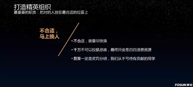 复星之前的经验证明,我们最大的损失不是一两个项目失败了,而是没有把不合适、不符合要求、不在企业家状态的人立刻换掉。不合适,就要尽快换,千万不可以投鼠忌器,最终只会是白白浪费资源。