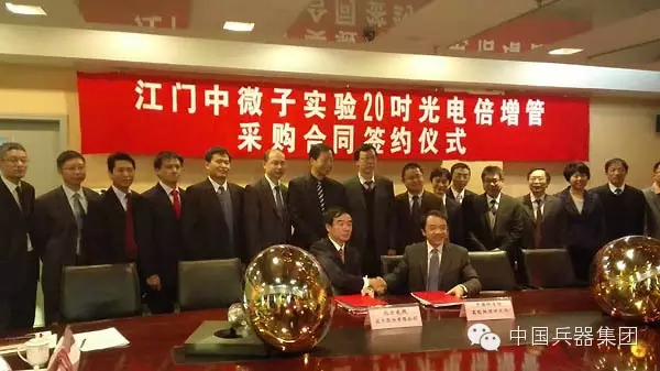 2015年12月16日,中国兵器工业集团北方夜视科技集团与中科院高能物理研究所就“20英寸光电倍增管采购合同”举行签约仪式。高能所正式委托夜视集团开始生产高性能微通道板型光电倍增管(MCP-PMT)。在为国家重大基础科研做出贡献的同时,也标志着夜视集团进入了国际光电倍增管主流供应商行列。