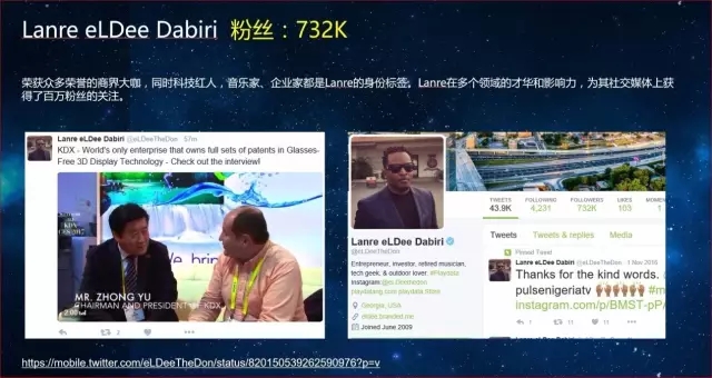彭博社对康得新的创新性发展及全球化布局给予重点报道,在海外商界与科技界引发巨大反响。美国商界领袖Lanre eLDee Dabiri在社交媒体上分享了钟玉董事长的专访视频,并介绍说康得新是全球唯一整套裸眼3D技术专利的持有者。此外,谷歌认证数字分析师和大数据专家Salih SARIKAYA也在社交网络上分享了钟玉董事长的专访视频。