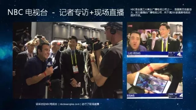 此外,康得新3D事业群常务副总裁张飚以现场直播的方式接受了美国最具影响力的主流媒体——NBC电视台的记者专访,向海外公众介绍康得新在裸眼3D领域的突出优势,并现场演示了搭载康得新裸眼3D解决方案的观3D V5手机,3D拍摄功能与3D游戏功能顿时惊艳全场,得到现场记者的称赞。