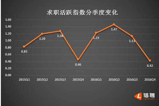 2016年四季度的求职活跃指数(当季登陆人数/2015-2016年间八季度平均登陆人数)为0.42,是过去两年的最低水平,明显受到年末招聘淡季的影响。