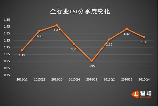 2016年四季度全行业TSI(TSI是Talent Shortage Index的缩写,指人才紧缺指数,TSI=有效需求岗位数/求职人数。TSI>1,表示人才供不应求;TSI<1,表示人才供大于求。如果TSI上升,表示人才紧缺程度加剧)为1.30,同比增长8.33%,表明人才供需情况好于2015年同期。