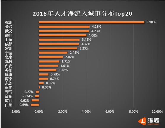 猎聘大数据研究院:2016年全年人才净流入城市分布Top20