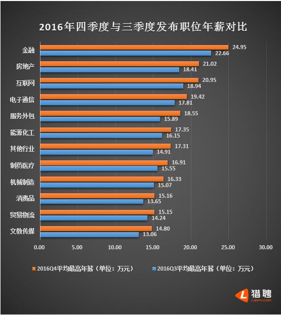 猎聘大数据研究院:2016年四季度与三季度发布职位年薪对比